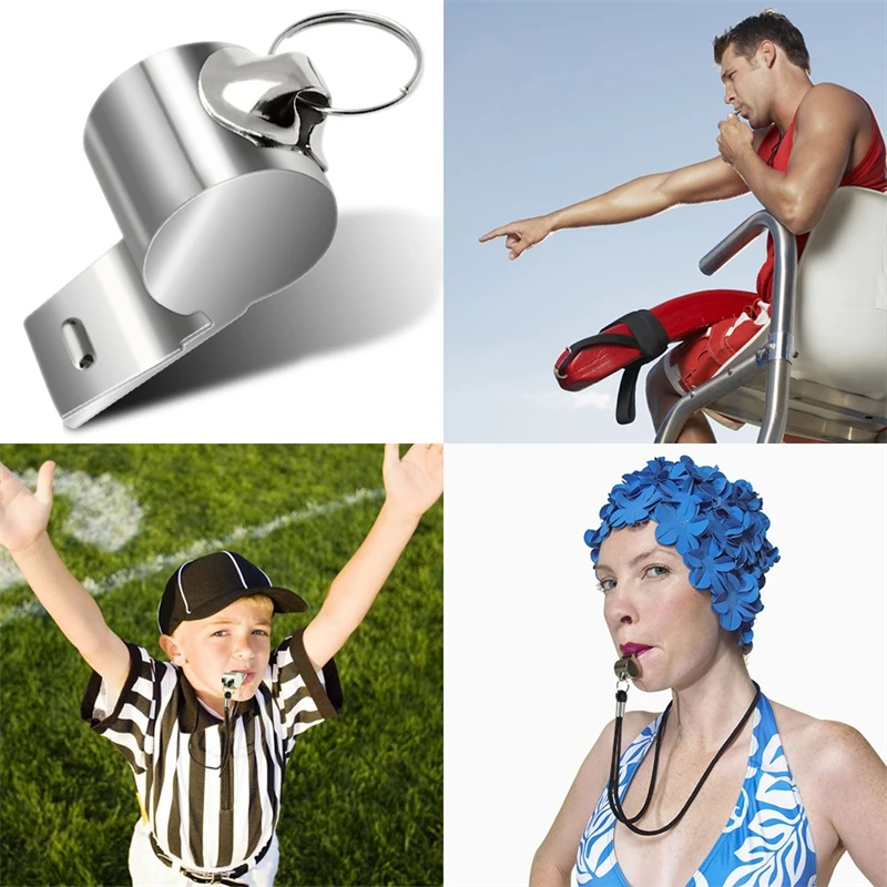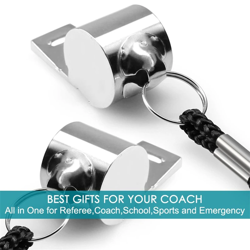 This set of stainless steel sports whistles is perfect for referees, coaches, and trainers across soccer, football, basketball, rugby, and cheerleading. Available in sets of 1, 5, or 10, each whistle comes with a durable rope for easy carrying and use.